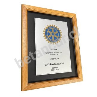 Marco de madera fondo de vidrio y placa con logo aplicado a color 30 x 38