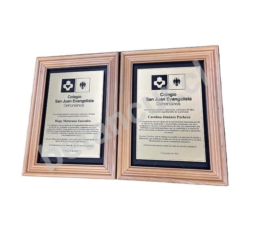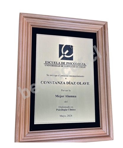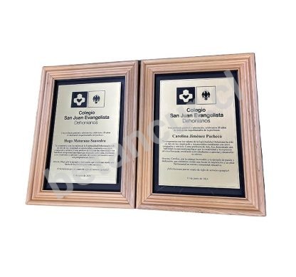 Diploma de madera rodón 23 con logotipo y placa dorada