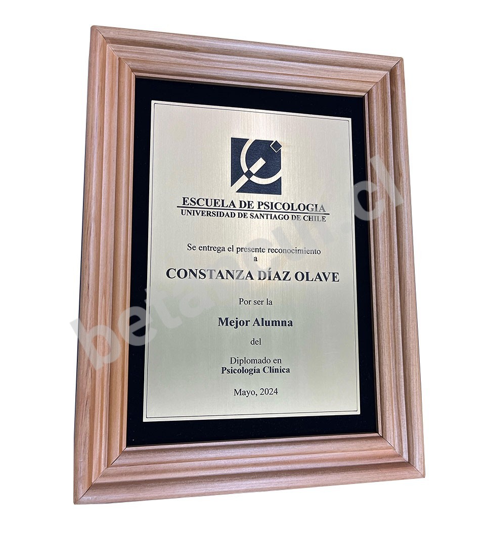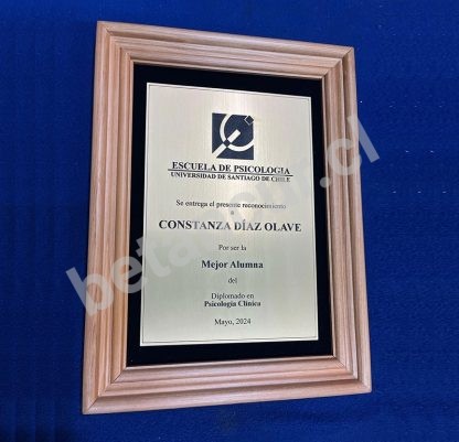 Marco de madera fondo de vidrio y placa metalex dorada 23